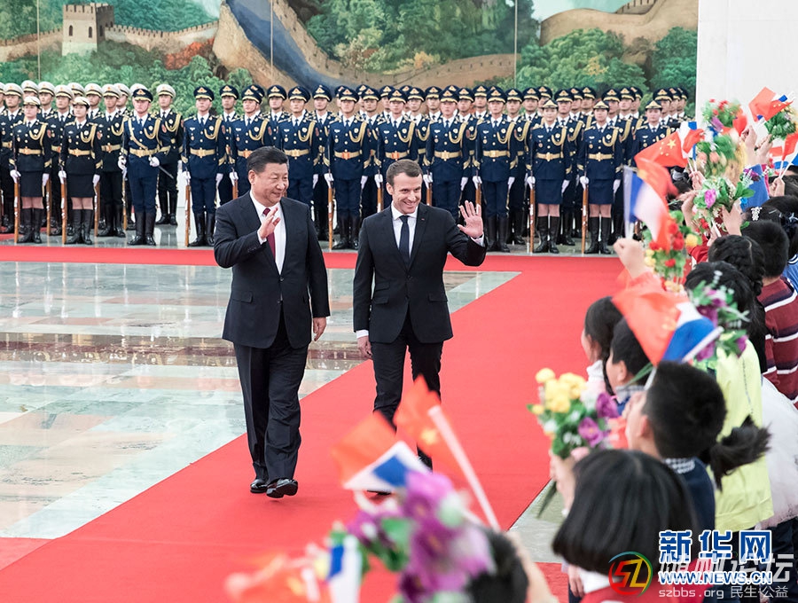 ( ]/ H5 z6 v9 q6 C; B 1月9日,國家主席習近平在北京人民大會堂同法國總統(tǒng)馬克龍舉行會談。這是會談前,習近平在人民大會堂北大廳為馬克龍舉行歡迎儀式。新華社記者 王曄 攝 新華社北京1月9日電(記者白潔 ...