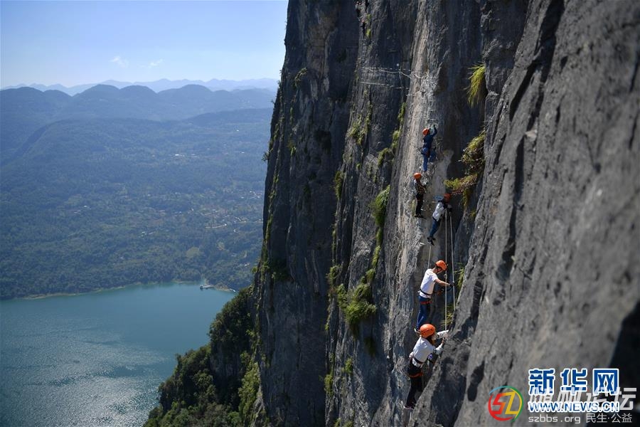 10月5日,游人在湖北省建始縣花坪鎮(zhèn)雞公嶺飛拉達(dá)攀巖戶外運(yùn)動(dòng)基地攀巖。國慶假期,湖北省建始縣雞公嶺飛拉達(dá)攀巖戶外運(yùn)動(dòng)基地迎來眾多游人。人們?cè)诟呖阵w驗(yàn)驚險(xiǎn)刺激的攀巖及走鋼絲橋運(yùn)動(dòng),挑戰(zhàn)自我、開心度假。新 ...