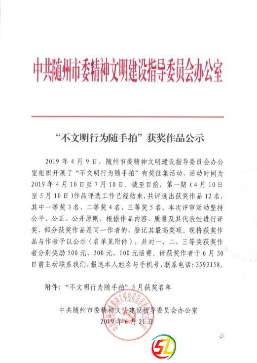 正文摘要:2019年4月9日,隨州市委精神文明建設(shè)指導(dǎo)委員會(huì)辦公室組織開展了“不文明行為隨手拍"有獎(jiǎng)?wù)骷顒?dòng),活動(dòng)時(shí)間為2019年4月10日至7月10日。截至目前,第一期(4月10日至5月10日)作品評選工作已經(jīng)結(jié)束,共評選出獲獎(jiǎng)作品12 ... |