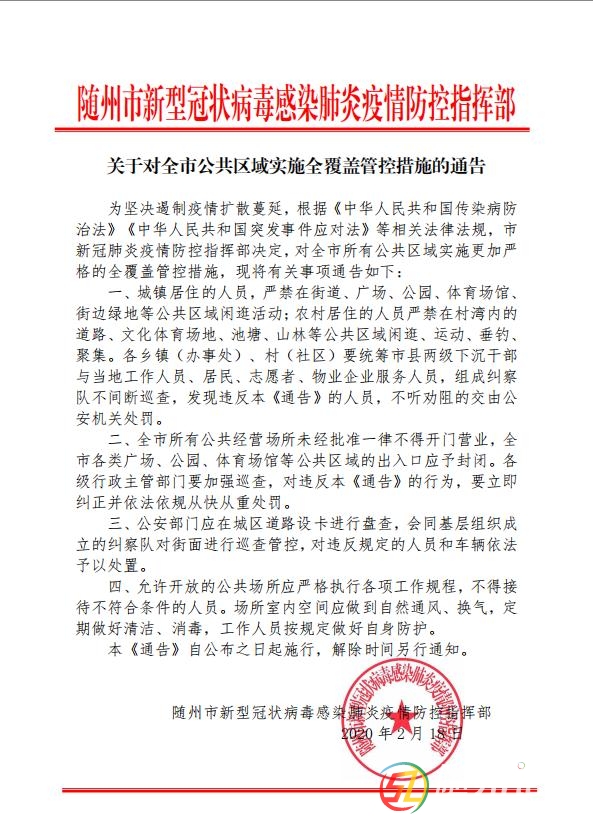 本帖最后由 隨州日?qǐng)?bào) 于 2020-2-19 10:23 編輯 9 y- n* T! V8 K; @8 d0 b) Q6 B7 c6 Q 6 T( w' N/ T) u9 E關(guān)于對(duì)全市公共區(qū)域?qū)嵤┤采w管控措施的通告 - o; @0 p# z+ F+ b 為堅(jiān)決遏制疫情擴(kuò)散蔓延, ...