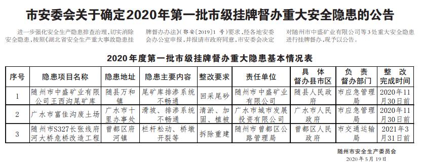 進(jìn)一步強(qiáng)化安全生產(chǎn)隱患排查治理,切實(shí)消除安全隱患,按照《湖北省安全生產(chǎn)重大事故隱患掛牌督辦辦法》(鄂安〔2019〕1 號(hào))要求,經(jīng)各地安委會(huì)辦公室申報(bào),并報(bào)請(qǐng)市政府同意,市安委會(huì)決定對(duì)隨州市中 ...