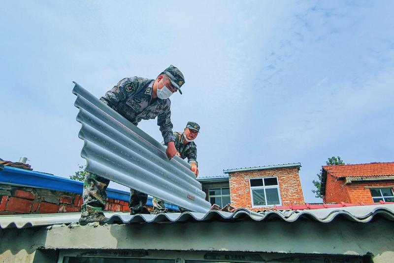 6月2日,隨州陸軍預(yù)備役工兵團(tuán)官兵來到曾都經(jīng)濟(jì)開發(fā)區(qū)太山廟村,向8戶受災(zāi)貧困戶捐贈(zèng)2萬元救災(zāi)物資款,并為他們修繕房屋。圖為官兵正在為該村6組貧困戶龔加連家補(bǔ)蓋石棉瓦。 ?。S州日?qǐng)?bào)全媒記者李文軍、 ...