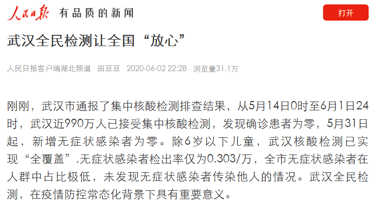 本帖最后由 隨州日?qǐng)?bào) 于 2020-6-4 15:26 編輯 2 a. A; Q/ [# p8 v2 g, l. N/ P 2 x) r) J2 g Q& b, X6月2日,武漢公布了集中核酸檢測(cè)排查的結(jié)果:從5月14日0時(shí)至6月1日24時(shí),武漢市集中核酸檢測(cè)9899828 ...