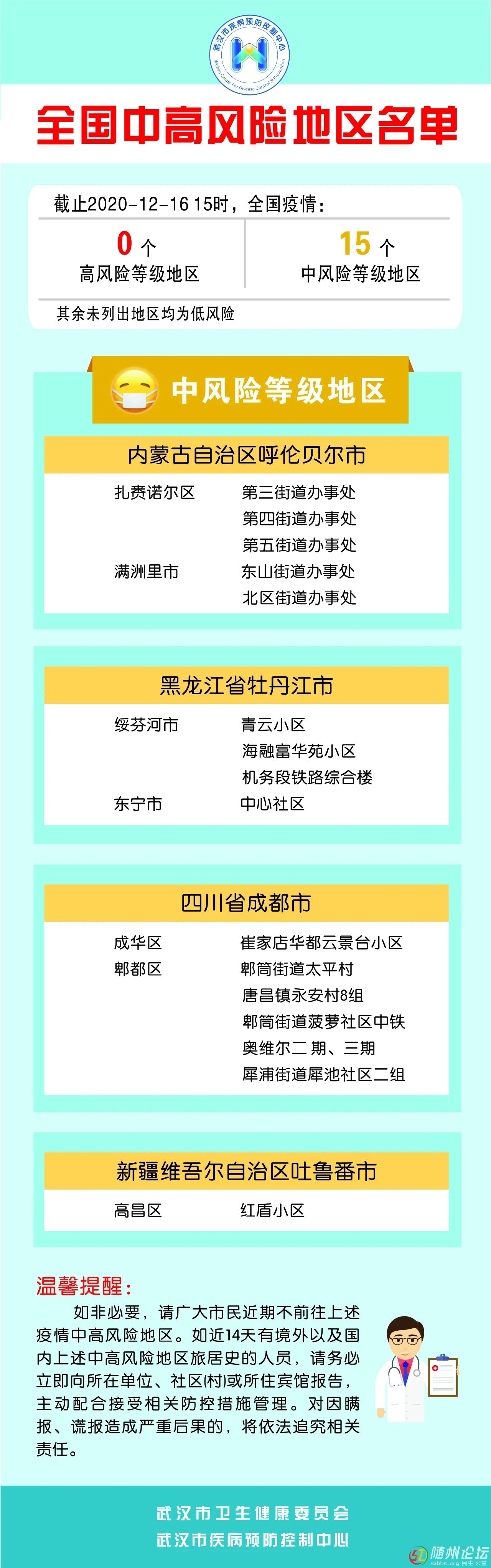 12月16日武漢市疾控中心發(fā)布了“全國疫情中高風險地區(qū)最新名單” 并進行了溫馨提示 來源:武漢市疾病預防控制中心