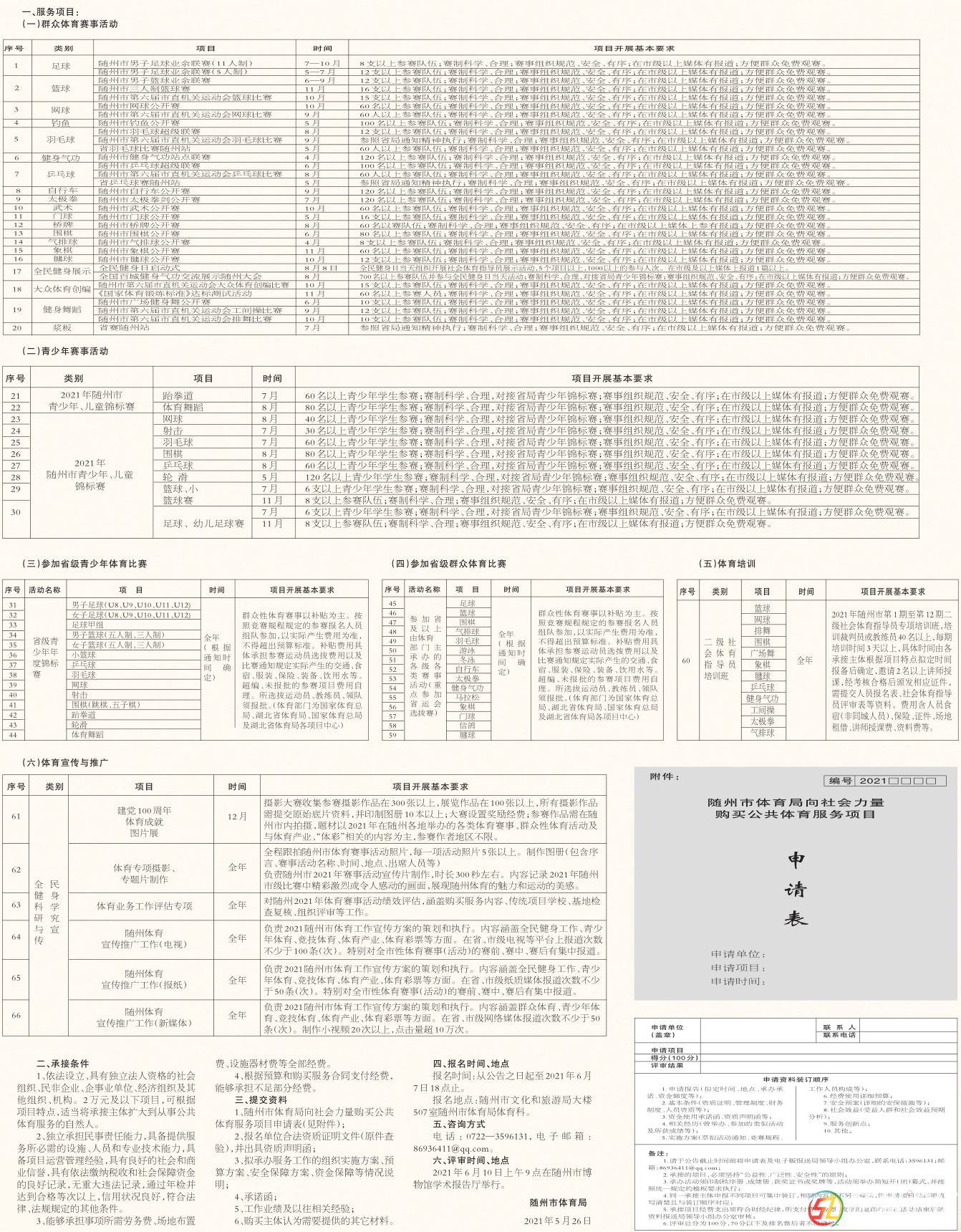 根據(jù)《市人民政府辦公室關(guān)于做好政府向社會(huì)力量購買公共文化服務(wù)的通知》(隨政辦發(fā)〔2017〕58號(hào))及《隨州市文化體育新聞出版廣電局向社會(huì)力量購買公共體育服務(wù)項(xiàng)目的實(shí)施方案》(隨文發(fā)〔2018〕6號(hào))文件精神 ...