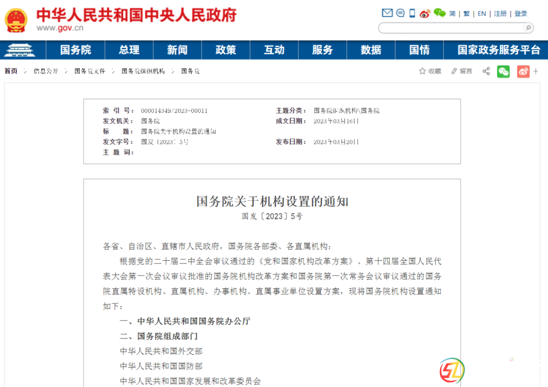 官網(wǎng)截圖* j% @0 u4 ?5 X4 J2 L ` J 國務院關(guān)于機構(gòu)設置的通知* |1 F1 ^" ?5 n& b9 ? a* g7 W( D 國發(fā)〔2023〕5號 - Q1 l- I V! V/ I4 h各省、自治區(qū)、直轄市人民政 ...