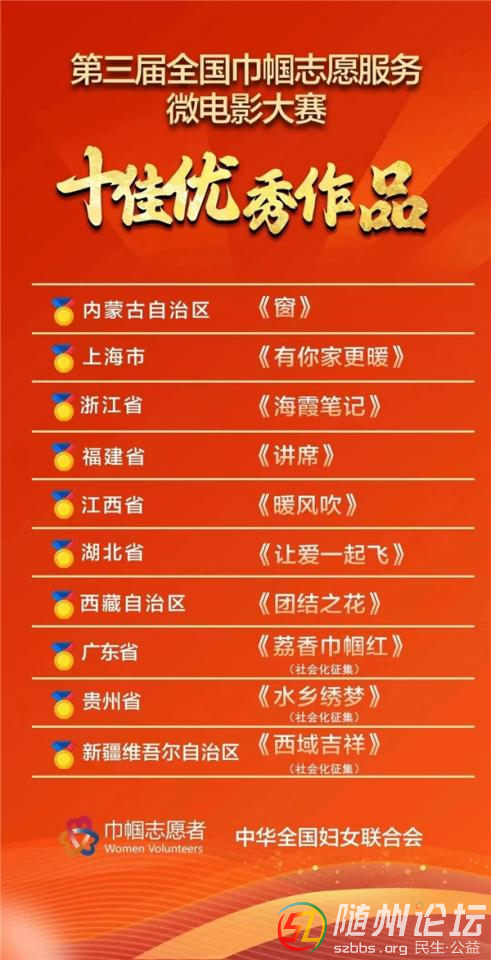 隨州日?qǐng)?bào)訊(通訊員郭國(guó))日前,全國(guó)婦聯(lián)舉行第三屆全國(guó)巾幗志愿服務(wù)微電影大賽、第六屆全國(guó)巾幗志愿服務(wù)征集展示活動(dòng)揭曉儀式,由隨州市婦聯(lián)上報(bào)的志愿服務(wù)微電影《讓愛(ài)一起飛》榮獲“十佳”優(yōu)秀作品。 ...
